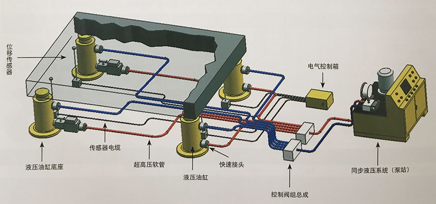 1.系統由液壓主站、PLC計算機控制系統、液壓終端、位移壓力檢測與人機界面操作系統五個部分組成。同步頂升/降落精度誤差小于土0.5mm